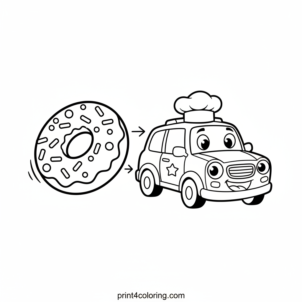 Get ready for a giggle! Our cheerful police car, wearing a tiny chef's hat, looks hilariously surprised as a giant, colorful donut rolls past its window. What flavors and sprinkles will you give this enormous treat? Grab your crayons and bring this sweet and silly scene to life!