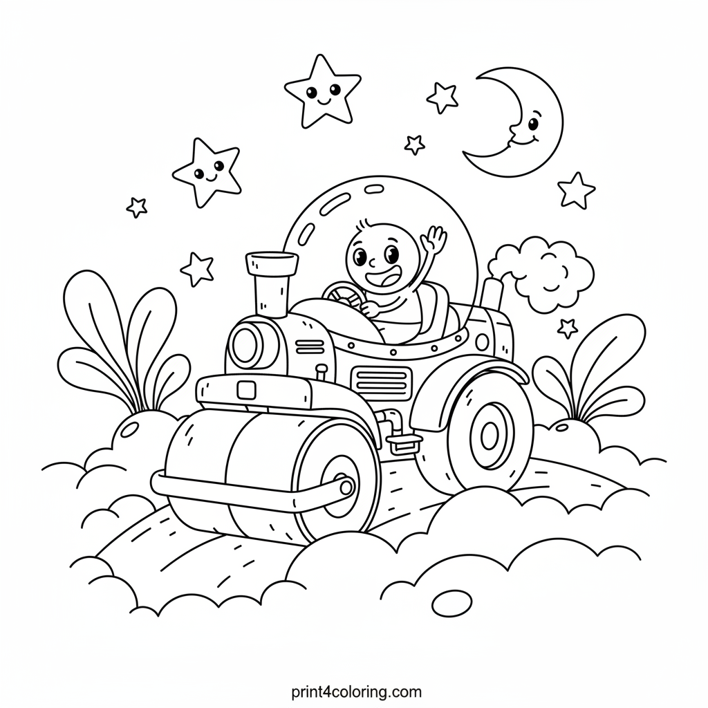 Join our brave steamroller driver on an out-of-this-world journey across Planet Puffball! This sturdy space machine, with its clear dome, is expertly flattening the soft, fluffy hills of an alien world. Imagine the squishy adventure under a sky twinkling with many stars. Get ready to add vibrant colors to this cosmic scene!