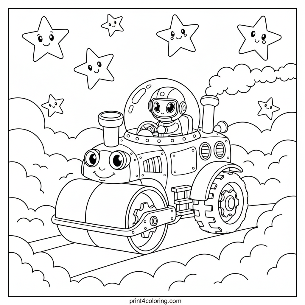 - 2🖍️ Shiny Steamroller - Give your space steamroller a cool, metallic look! Use shades of silver, grey, or even bright primary colors like red or blue, adding some darker lines for shadows and details.