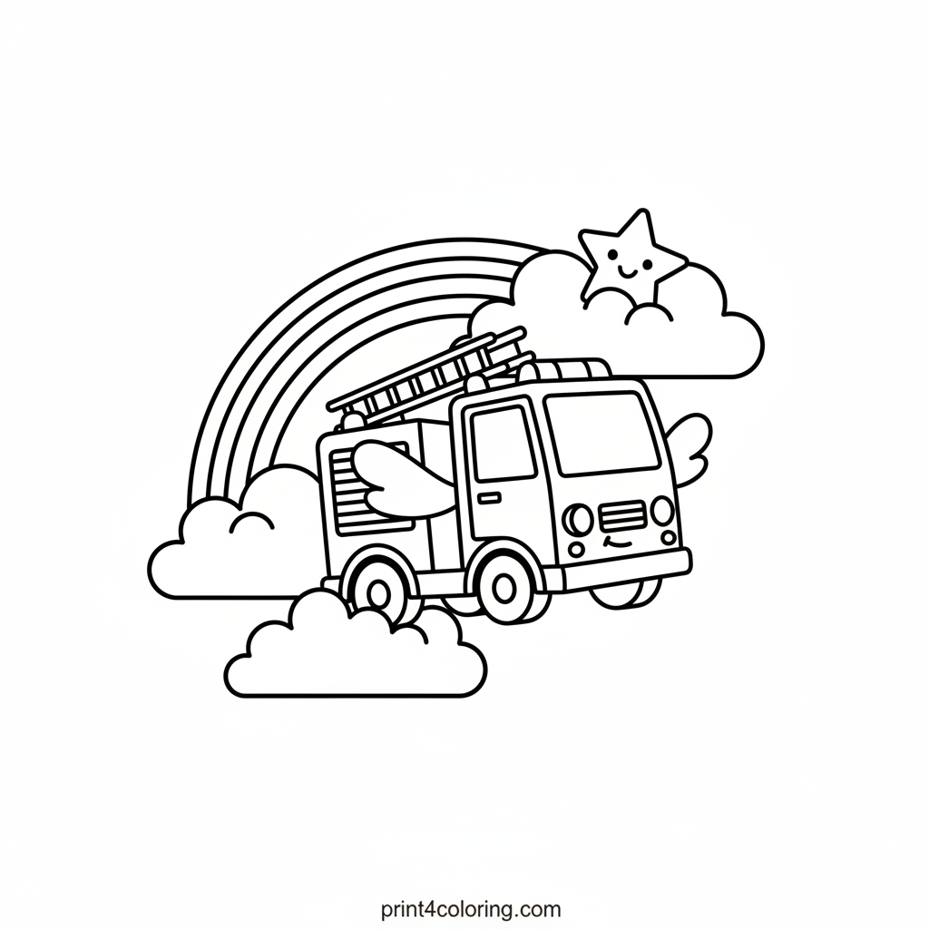 Imagine a brave fire truck with tiny, friendly wings, flying high above the world! This magical hero soars through soft, fluffy clouds, leaving a beautiful rainbow trail behind. A cheerful star peeks out, watching its sky adventure. Get ready to color this wondrous scene and bring its vibrant magic to life!
