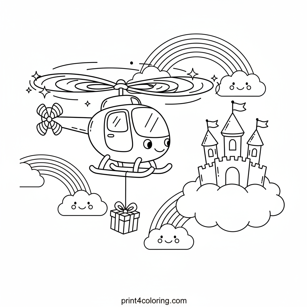 Soar into a world of wonder with this magical coloring page! A sparkling helicopter zips through vibrant rainbow clouds, carrying a special delivery to a whimsical castle floating high above. Imagine the secret package inside and the friendly creatures waiting in the cloud kingdom. Get ready for an enchanting adventure!