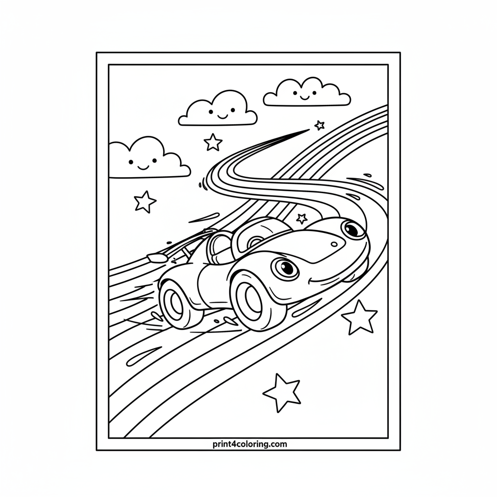Get ready for an epic adventure! This coloring page features a super-fast, futuristic race car speeding across a magnificent glowing rainbow track. Zoom past fluffy, happy clouds and sparkling stars in a sky full of wonder. Imagine the thrill of this cosmic race!