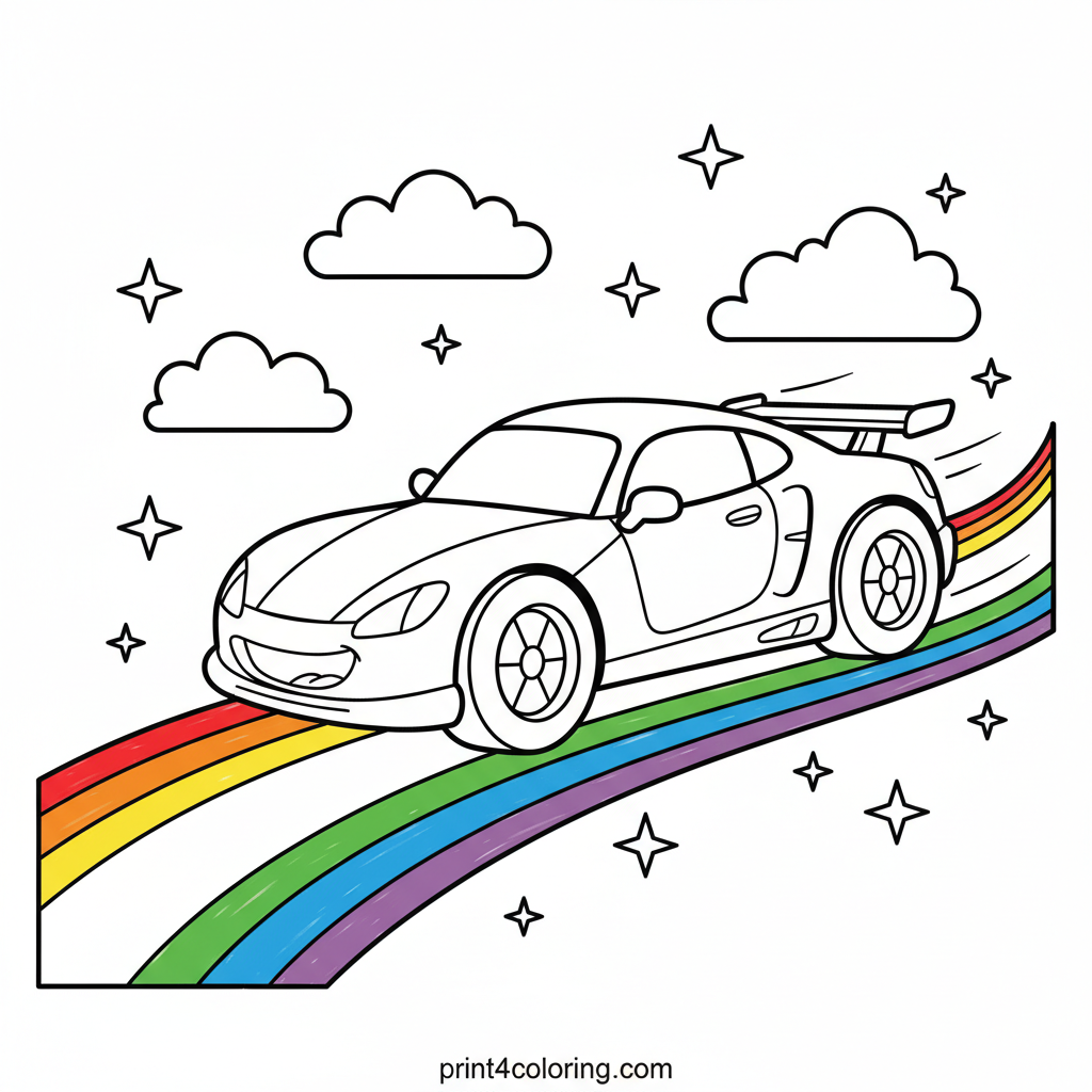 #race car#futuristic#rainbow#sky#clouds#stars#speed#fantasy#coloring-page#printable