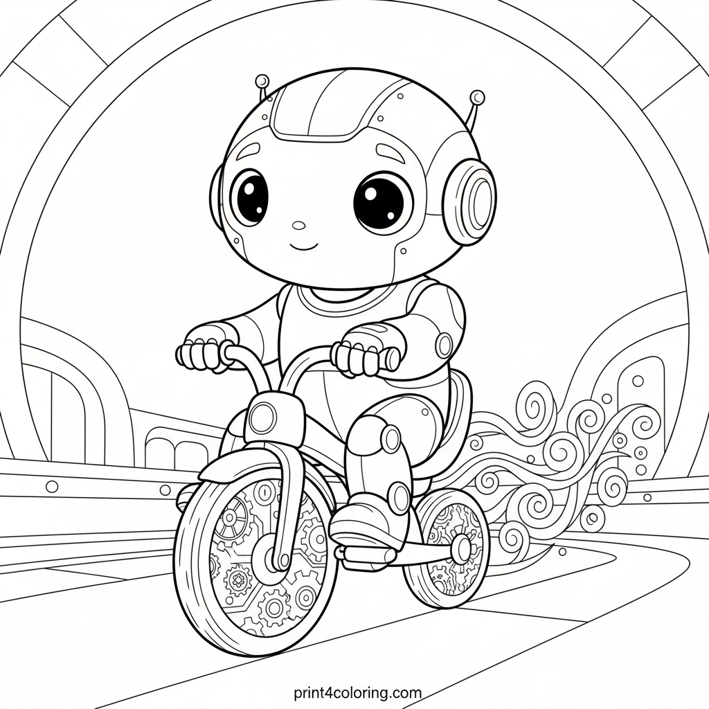 Join Robo-Rider in a thrilling futuristic race! This determined robot speeds along on its high-tech tricycle, leaving a trail of geometric energy. Its wheels boast intricate gear and circuit board patterns, while abstract architecture fills the background. A dynamic and exciting challenge awaits your creative colors!