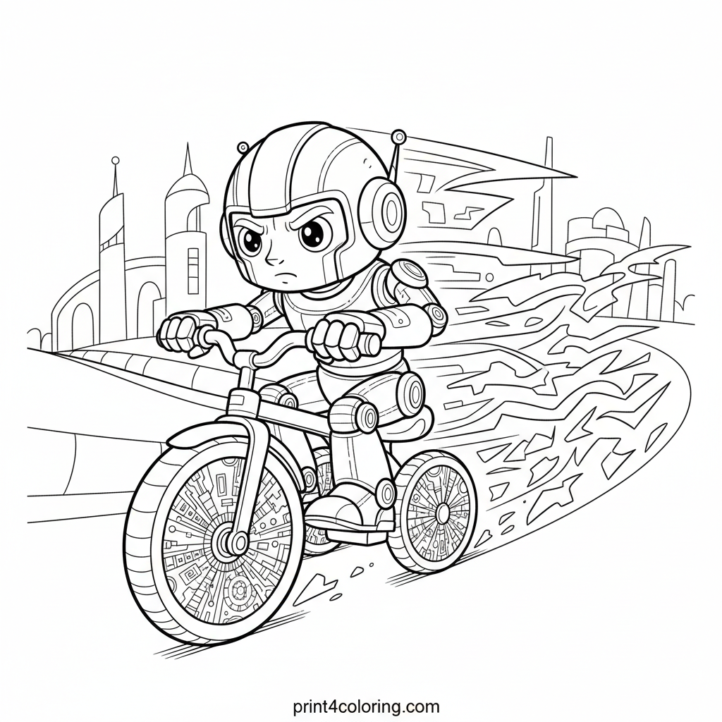 Zoom into the future with Robo-Rider! This sleek robot pedals its high-tech tricycle at top speed, leaving dynamic energy trails. Notice the intricate gear and circuit board patterns on its wheels and the futuristic race track. Get ready to color a scene bursting with motion and excitement!