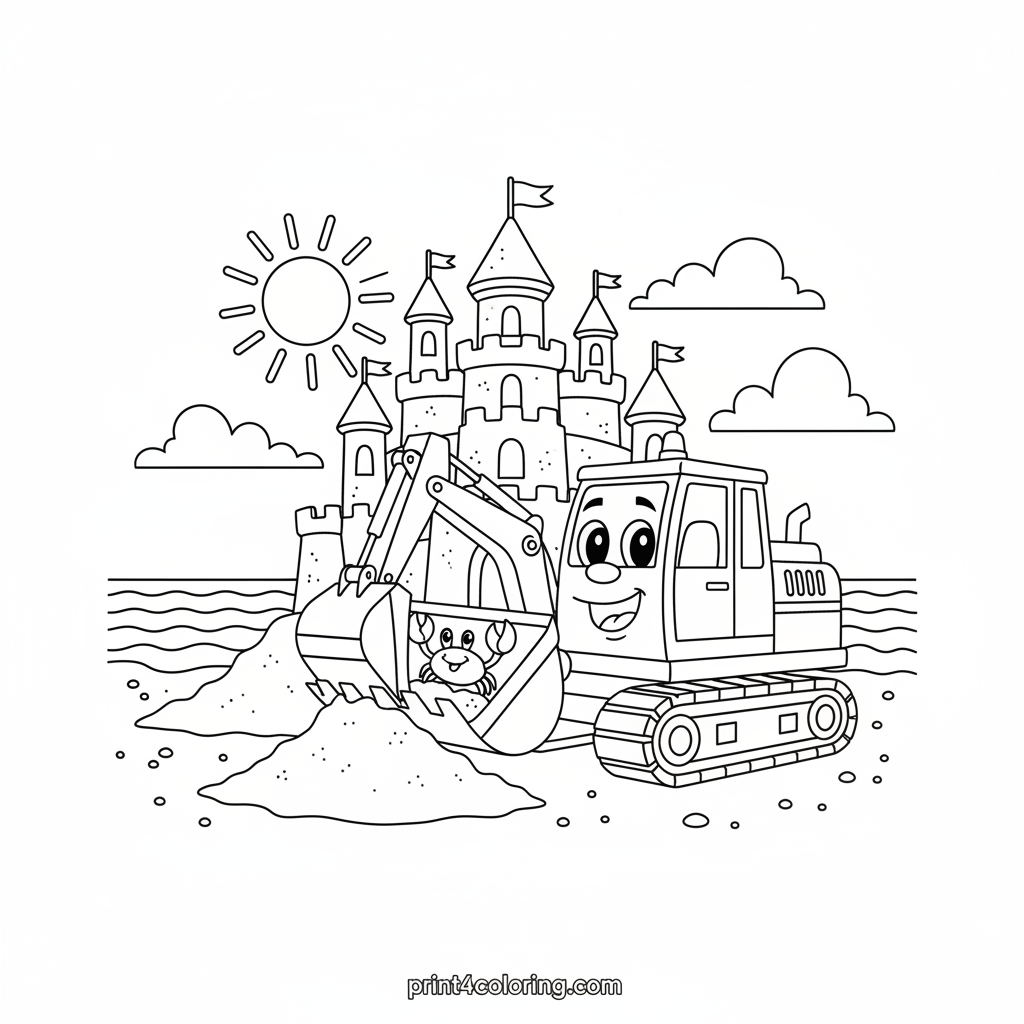 Join Sandy Scoop, the cheerful excavator, as he carefully builds an amazing multi-turreted sandcastle on a sunny beach! With a big smile and friendly eyes, he gently scoops sand while a little crab waves hello from his bucket. Get ready to add vibrant colors to this delightful beach scene!