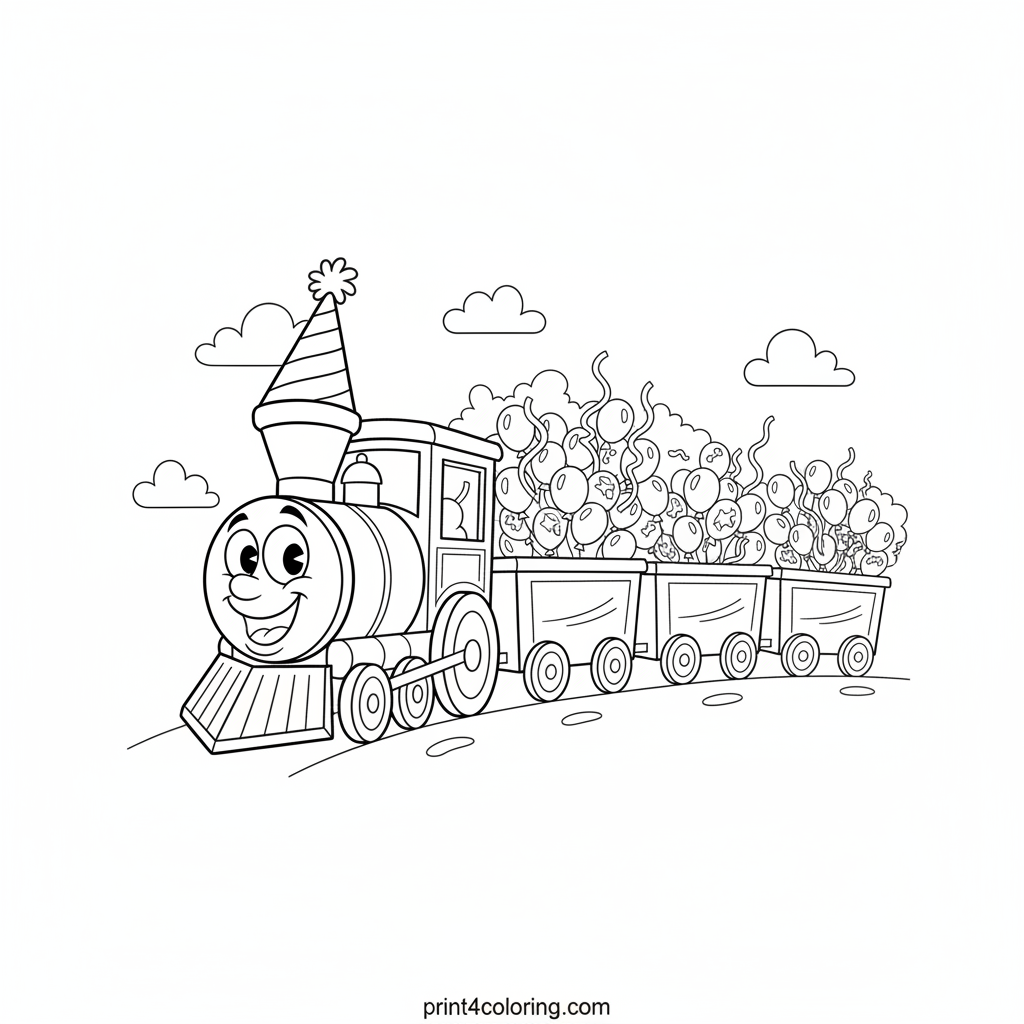All aboard for fun! This silly train is ready to celebrate with a huge grin and a festive striped party hat on its smokestack. Its carriages are bursting with balloons and streamers, inviting you to add vibrant colors to this joyful journey. Imagine the party destinations this happy train could be heading to!
