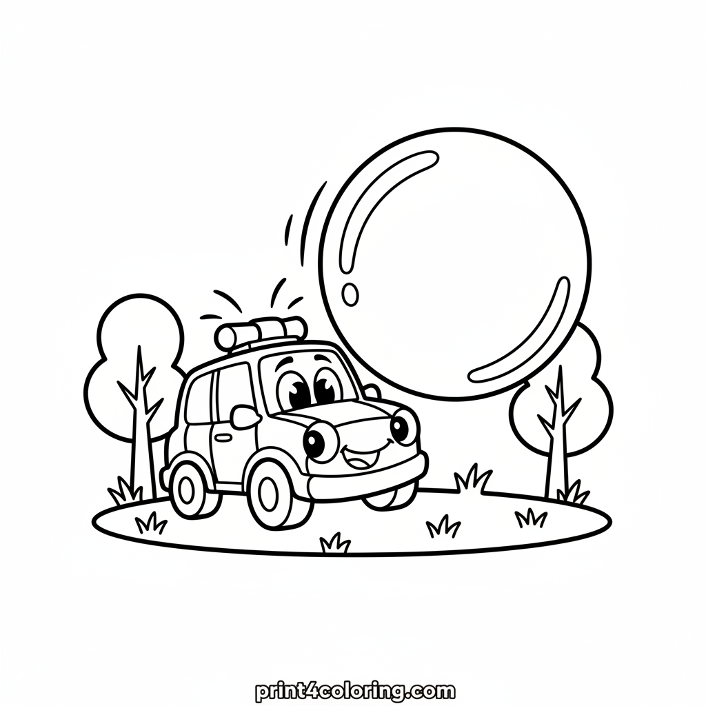 Join a playful police car with a big, goofy smile on a super silly chase! Its siren makes a funny 'boop-boop' sound as it playfully pursues a giant, shimmering bubble through a sunny park. Imagine the vibrant colors of the bubble and the happy car on this whimsical adventure, ready for your creative touch!