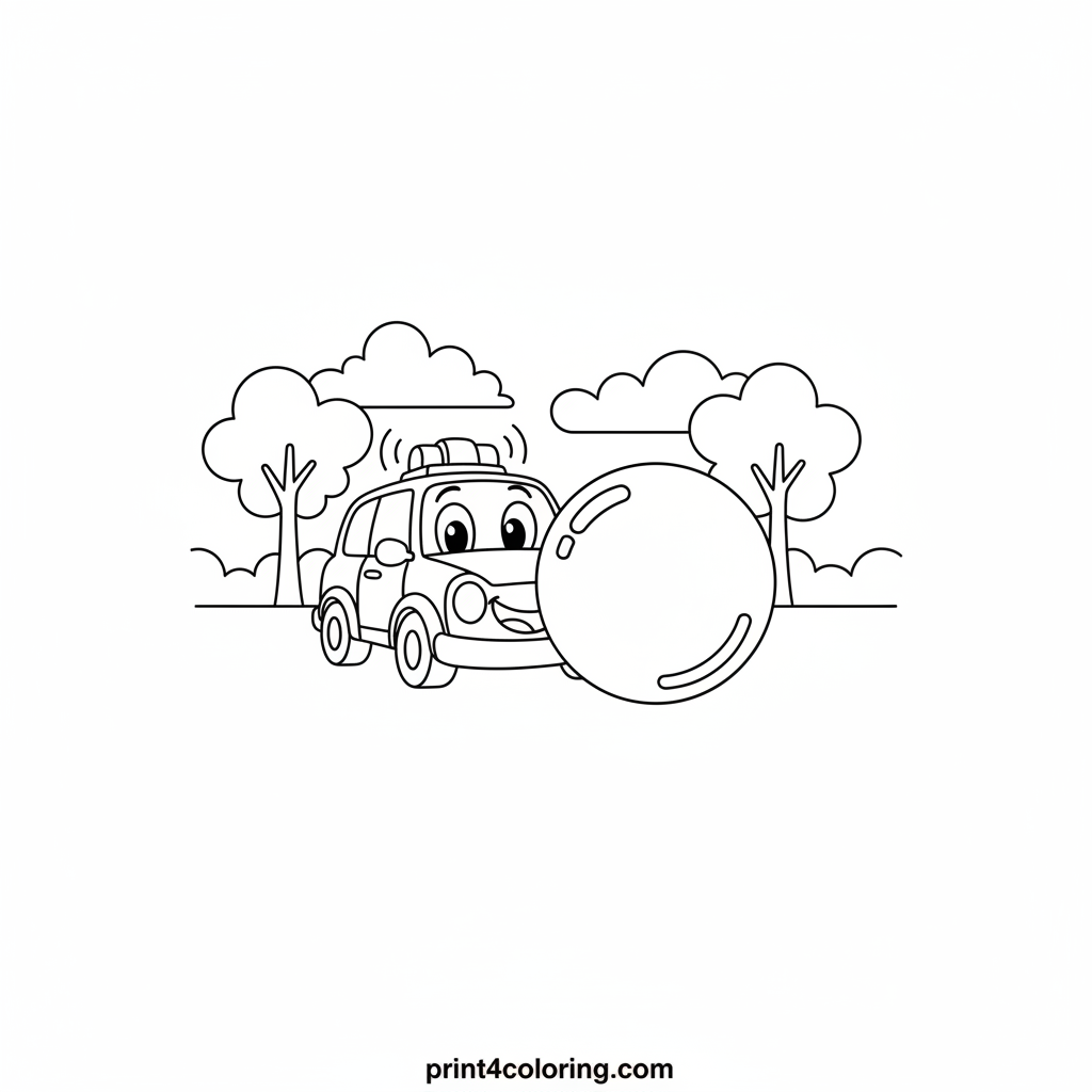 Get ready for a giggle-filled adventure! A friendly police car with a funny face is on a hilarious chase, trying to catch a giant, shimmering bubble floating through a sunny park. Its siren goes "boop-boop" as it playfully zips along. Grab your crayons and bring this joyful scene to life!