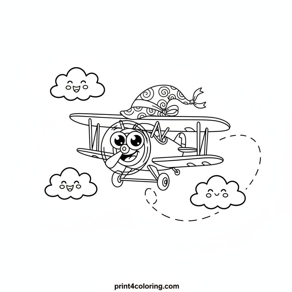 Join our hilarious biplane with its big googly eyes and a floppy propeller hat for a super silly sky adventure! Watch as it wobbles happily through a sky full of giggling clouds, bringing smiles wherever it flies. Get ready to add vibrant colors to this comical aviation scene and make the sky burst with joy!