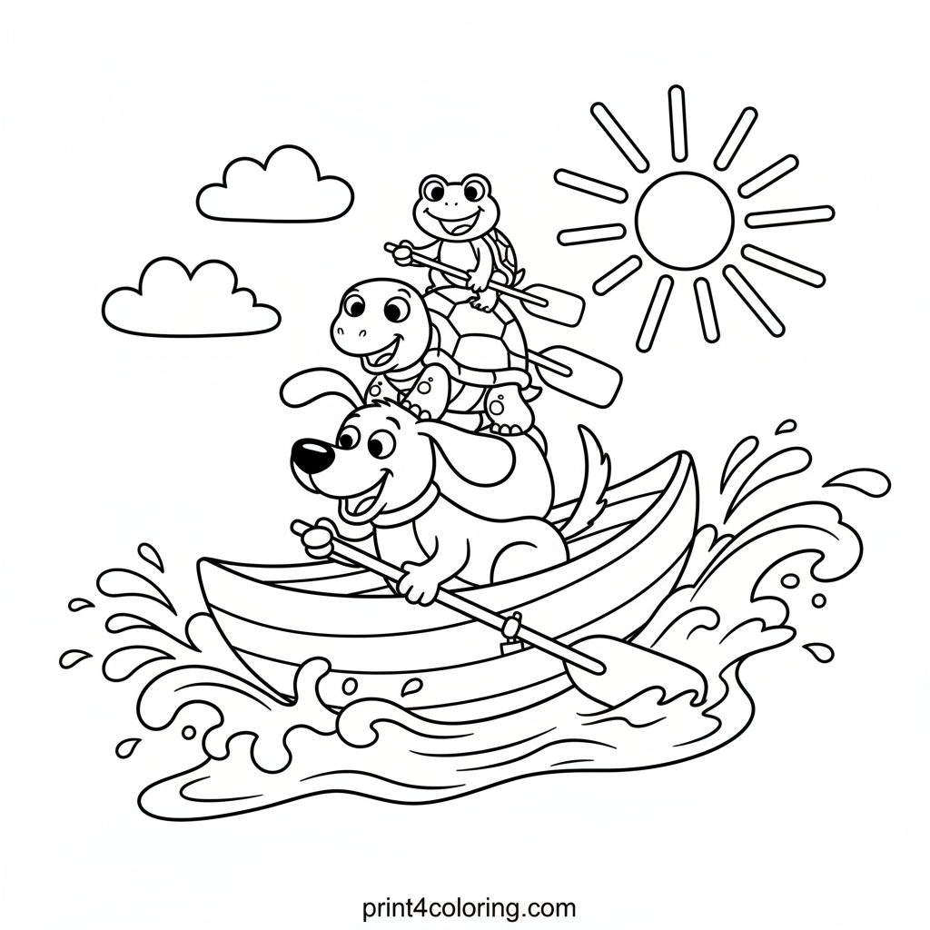Dive into a hilarious scene where a wobbly rowboat carries the most comical stack of animals! A tiny frog perches on a friendly turtle, who's riding on a cheerful dog. They're all trying their best to paddle with giant oars, looking wonderfully surprised but absolutely happy. Get ready to add bright colors to this splashy, silly adventure!