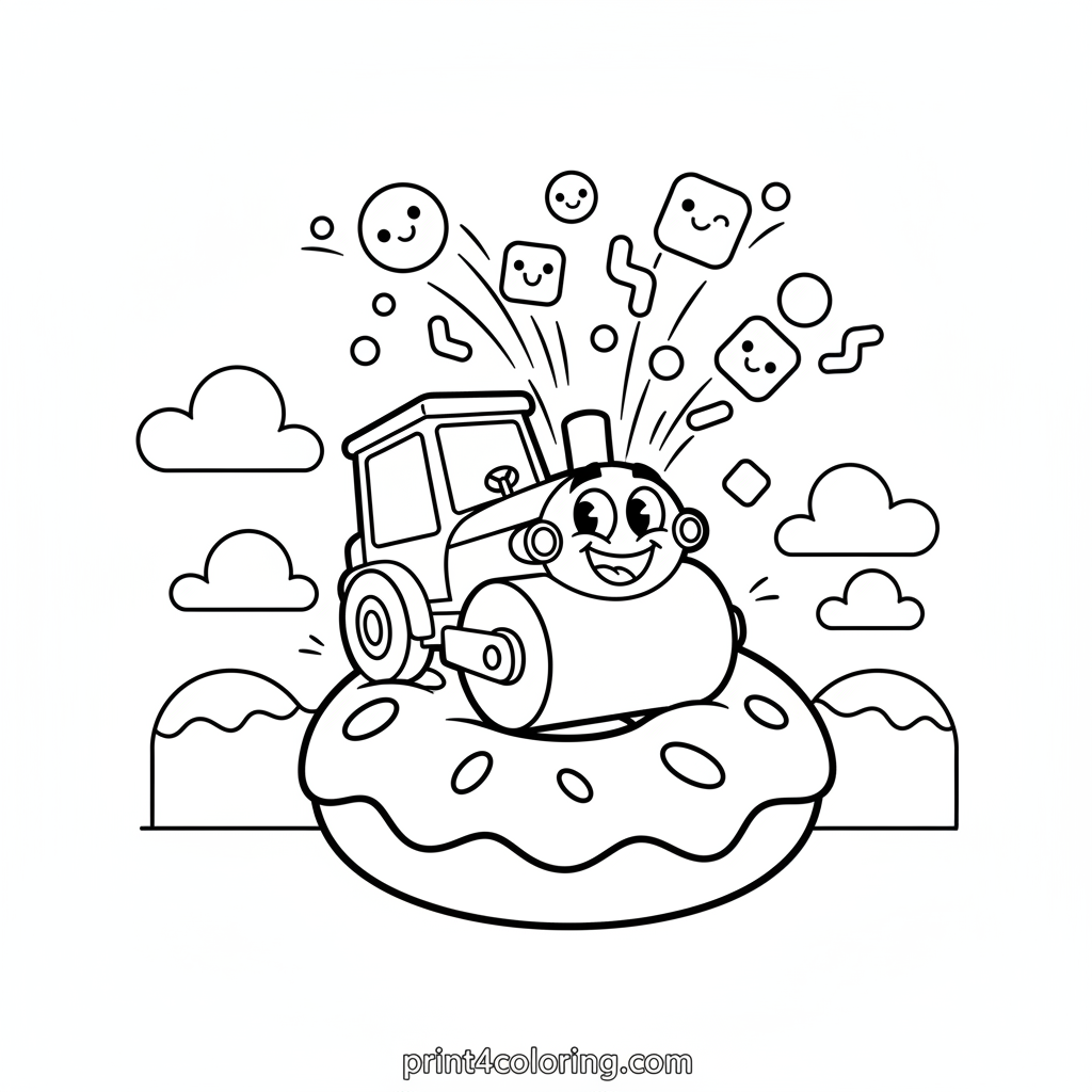 Get ready for a super sweet adventure! This coloring page features a happy, grinning steamroller playfully flattening a giant, pretend doughnut. Watch the colorful sprinkles fly through the air as our friendly machine enjoys its sugary mission. A delightful scene for little artists to bring to life with their favorite colors and imagination!