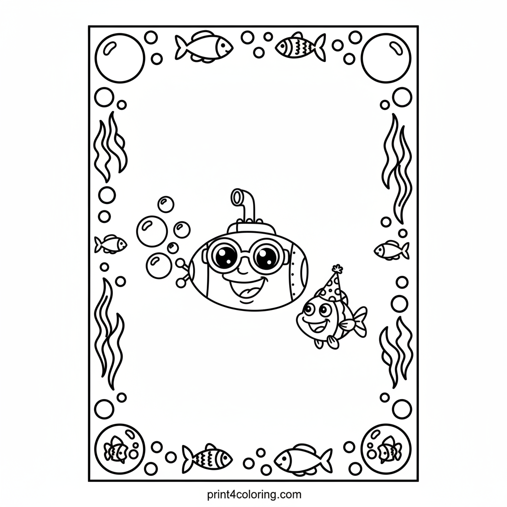 Dive into an underwater adventure with our Silly Submarine! This goofy yellow submarine wears big goggles and blows enormous, playful bubbles. A happy fish in a party hat swims nearby, joining the bubbly fun. Grab your crayons and bring this joyful ocean scene to life with vibrant colors!