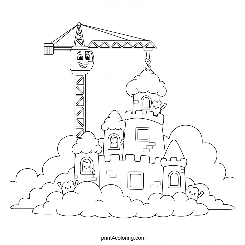 Join a cheerful construction crane as it carefully places the final, majestic turret onto a magical cloud castle! Look closely and you'll spot cute, friendly cloud characters waving from their cozy windows. This whimsical scene invites you to add your brightest colors to a dreamy world high above the ground.