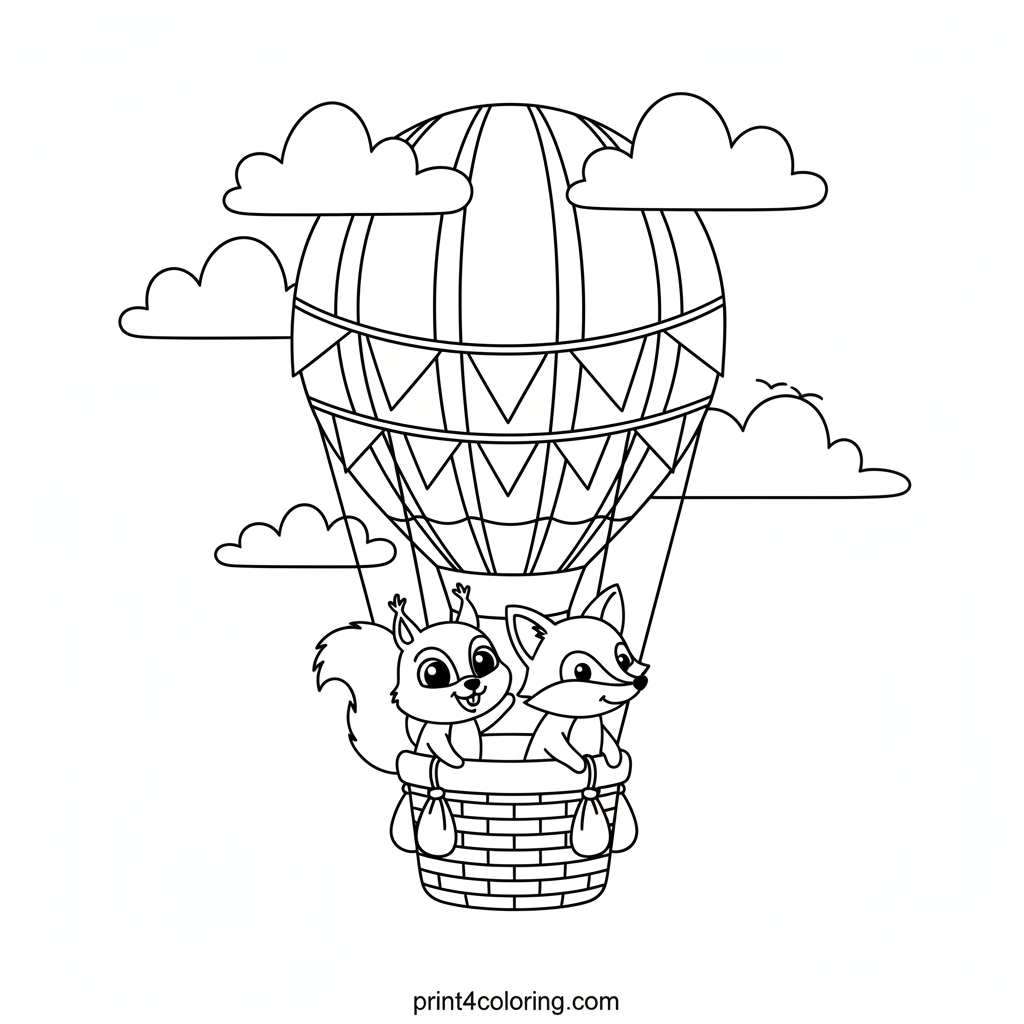 Join a brave squirrel and a clever fox on an amazing journey above the clouds! They're soaring in their colorful striped hot air balloon, navigating through fluffy white clouds with festive banners waving in the breeze. Imagine all the vibrant colors you can use to bring this high-flying friendship to life!