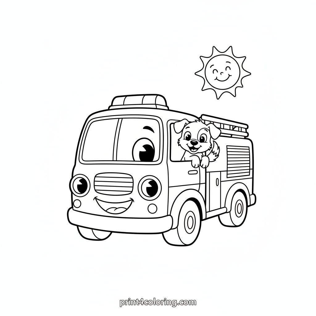 Meet a cheerful, round fire truck with big, happy eyes and a friendly smile! An adorable tiny puppy peeks out from the driver's window, wagging its tail, ready for fun. A happy sun brightens the simple background. Perfect for little artists to color with joy!