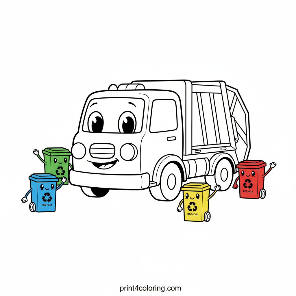 Meet our super cheerful cartoon garbage truck with a big, friendly smile and bright eyes, ready to help keep our streets clean! He's surrounded by his happy little recycling bin friends, all waving hello. Grab your crayons and bring this helpful scene to life with vibrant colors!