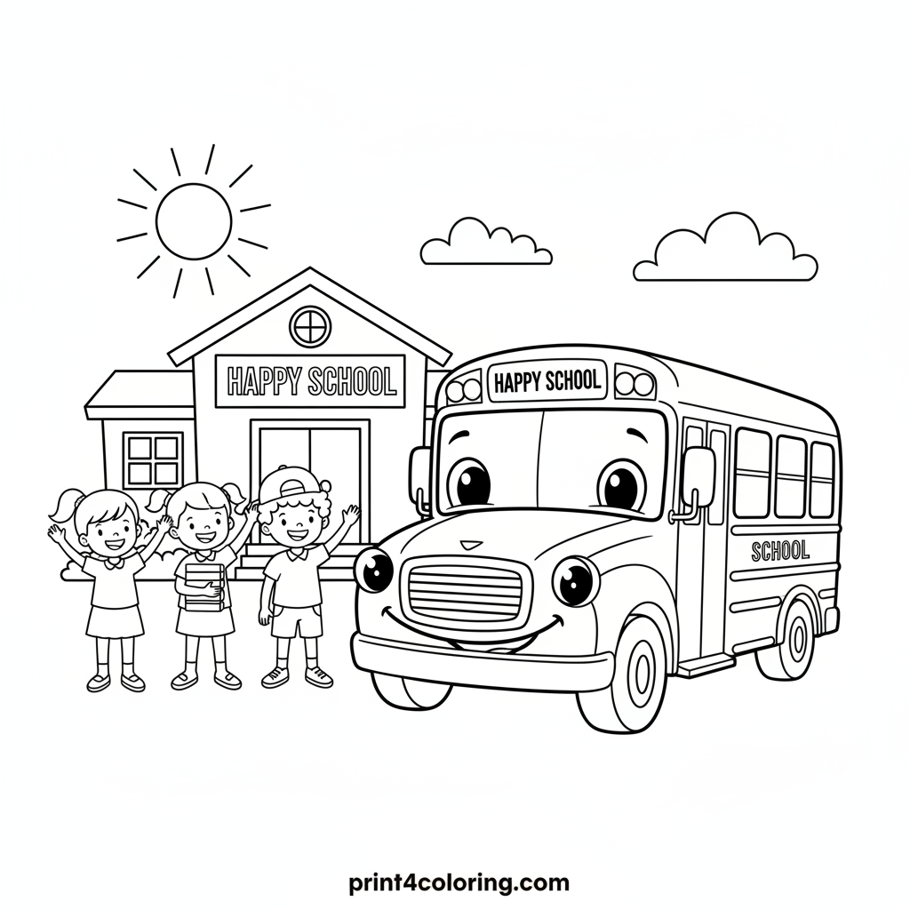 Hop aboard for a colorful adventure! This cheerful school bus, with its big smile and kind eyes, is ready to greet you. Parked happily in front of the school, a few waving kids add to the fun. Bring this heartwarming scene to life with your favorite colors, imagining the joy of a new school day!