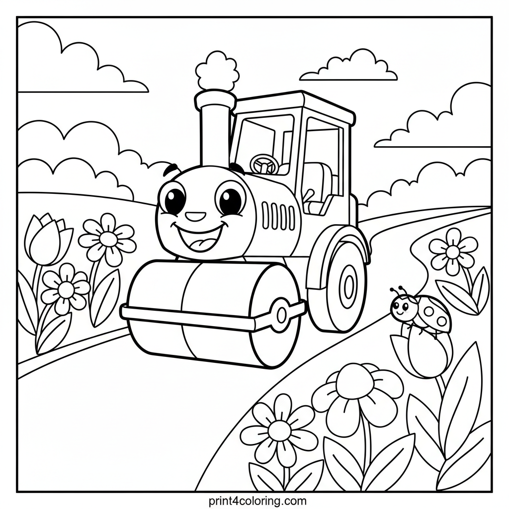 Join our cheerful steamroller with big, friendly eyes as it carefully rolls a winding garden path. Simple flowers bloom all around, and a tiny ladybug watches the hard work. A perfect scene for little artists to bring to life with bright colors!