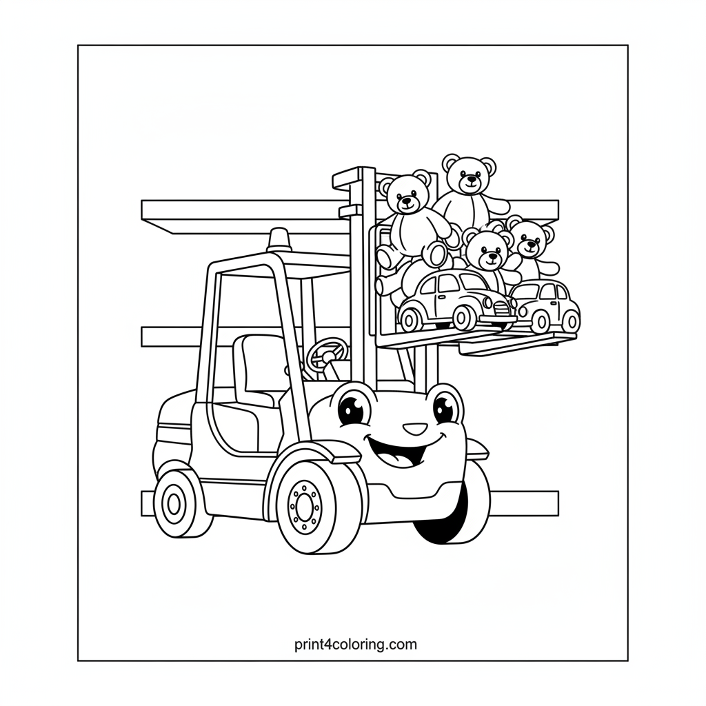 Meet Smiley, the happiest forklift you'll ever see! With big, friendly eyes, Smiley is carefully moving a stack of soft teddy bears and bright toy cars to their new home on a shelf. Imagine all the colors you can use to bring this helpful toy lifter and his precious cargo to life!