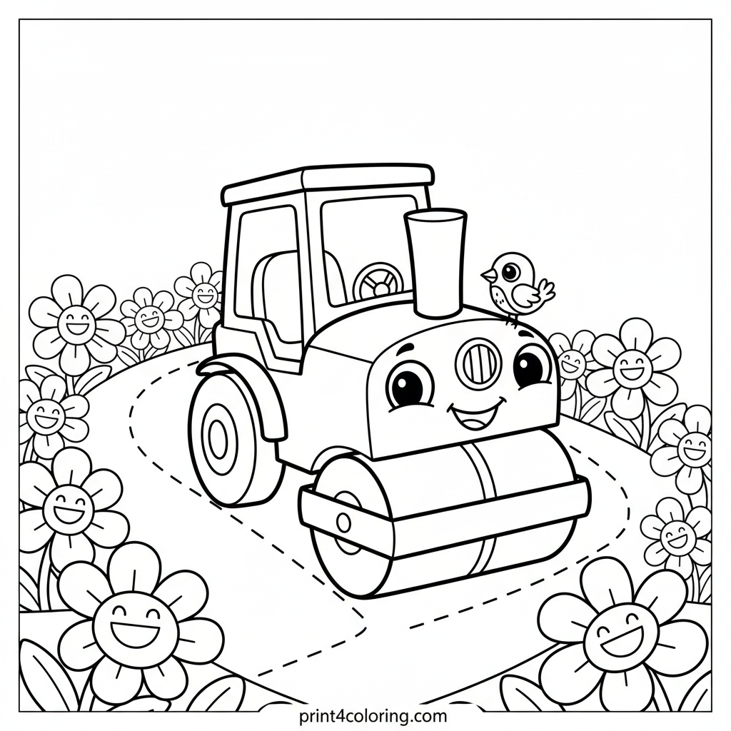Meet our happy steamroller, ready for a colorful adventure! With big, friendly eyes and a wide smile, it gently rolls along a path bursting with vibrant flowers. A tiny, cheerful bird has even made a new friend, perching happily on its smooth roller. Get ready to add your favorite colors to this delightful scene!