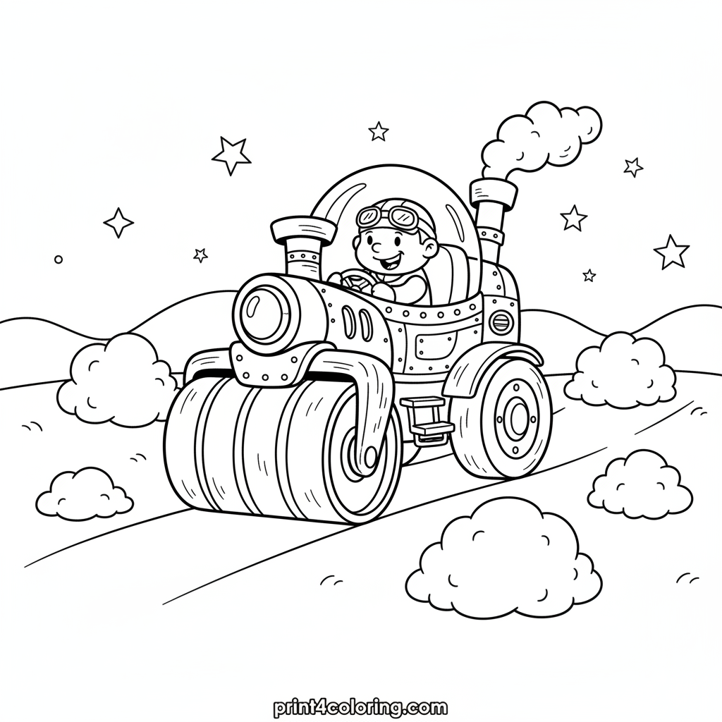 Join our friendly space steamroller as it gently rolls across the whimsical Planet Puffball! With a transparent dome for its brave driver, this unique vehicle navigates soft, fluffy hills under a sky twinkling with multiple stars. Imagine the squishy adventure and the vibrant colors you can use to bring this alien landscape to life!