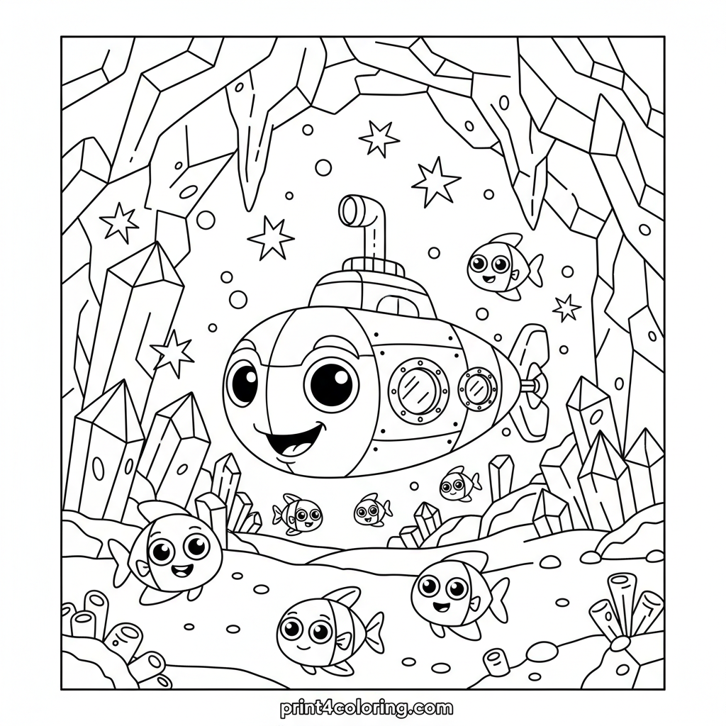 Imagine a brave little submarine exploring a secret underwater world! This magical cavern is aglow with countless sparkling crystals and friendly bioluminescent creatures with big, curious eyes. Dive into this enchanting scene and bring its vibrant colors to life. A truly wondrous adventure awaits your crayons!