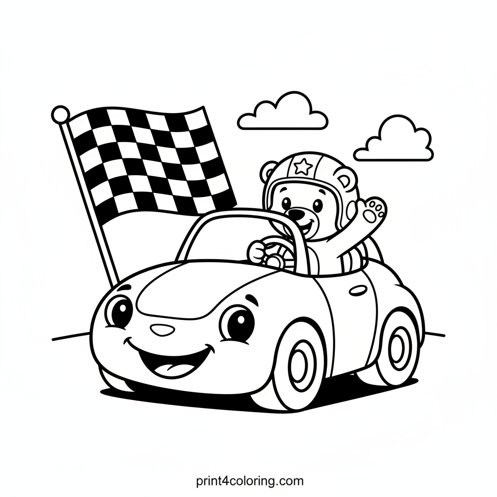 Get ready for an adorable race day adventure! Color a super friendly, smiling race car with big, happy eyes, parked beside its cute bear cub driver. The little bear waves excitedly from the cockpit, ready for fun. A simple checkered flag waves in the background, adding to the excitement.