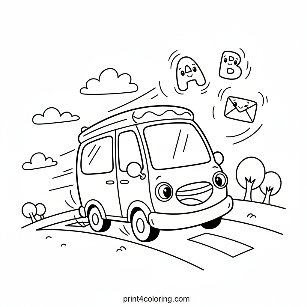 Get ready for a thrilling coloring journey with our speedy mail van! This cheerful vehicle, sporting a happy face, is zipping along a winding road. Watch as friendly letters playfully flutter behind it, ready to deliver smiles. Grab your crayons and bring this exciting scene to life!