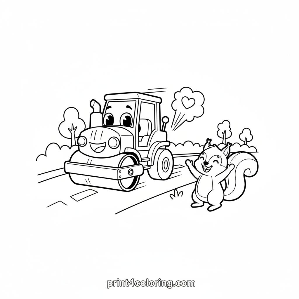 Get ready to color a super speedy and cheerful steamroller! Watch as it zooms along, laying down a perfectly smooth, brand-new road. A friendly squirrel waves hello from the side, and a little puff of happy dust trails behind, making the whole scene bright and joyful.