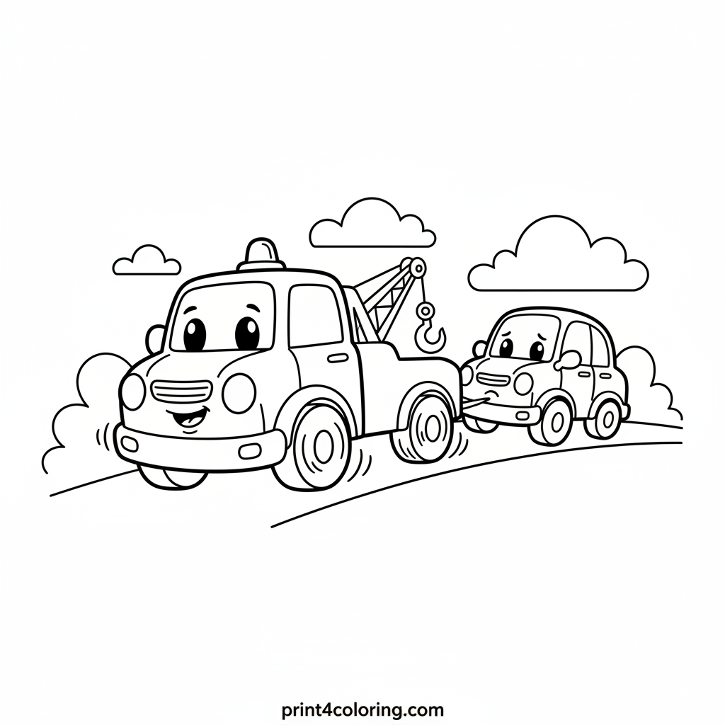 Get ready for an exciting adventure! This mighty tow truck is zooming into action, ready to save the day. Watch as its strong hook carefully pulls a little car that needs a helping hand. Imagine the bright colors you'll use to bring this heroic rescue scene to life! It's an easy and fun page to color.