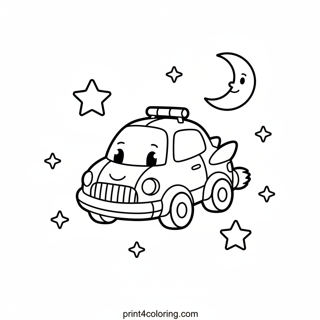 Join a friendly space police cruiser on its stardust ride! With cool rocket boosters, it floats gently through a sky filled with twinkling stars and crescent moons. Imagine zooming through the cosmos on patrol. Bring this futuristic adventure to life with your brightest colors and help keep the galaxy safe!