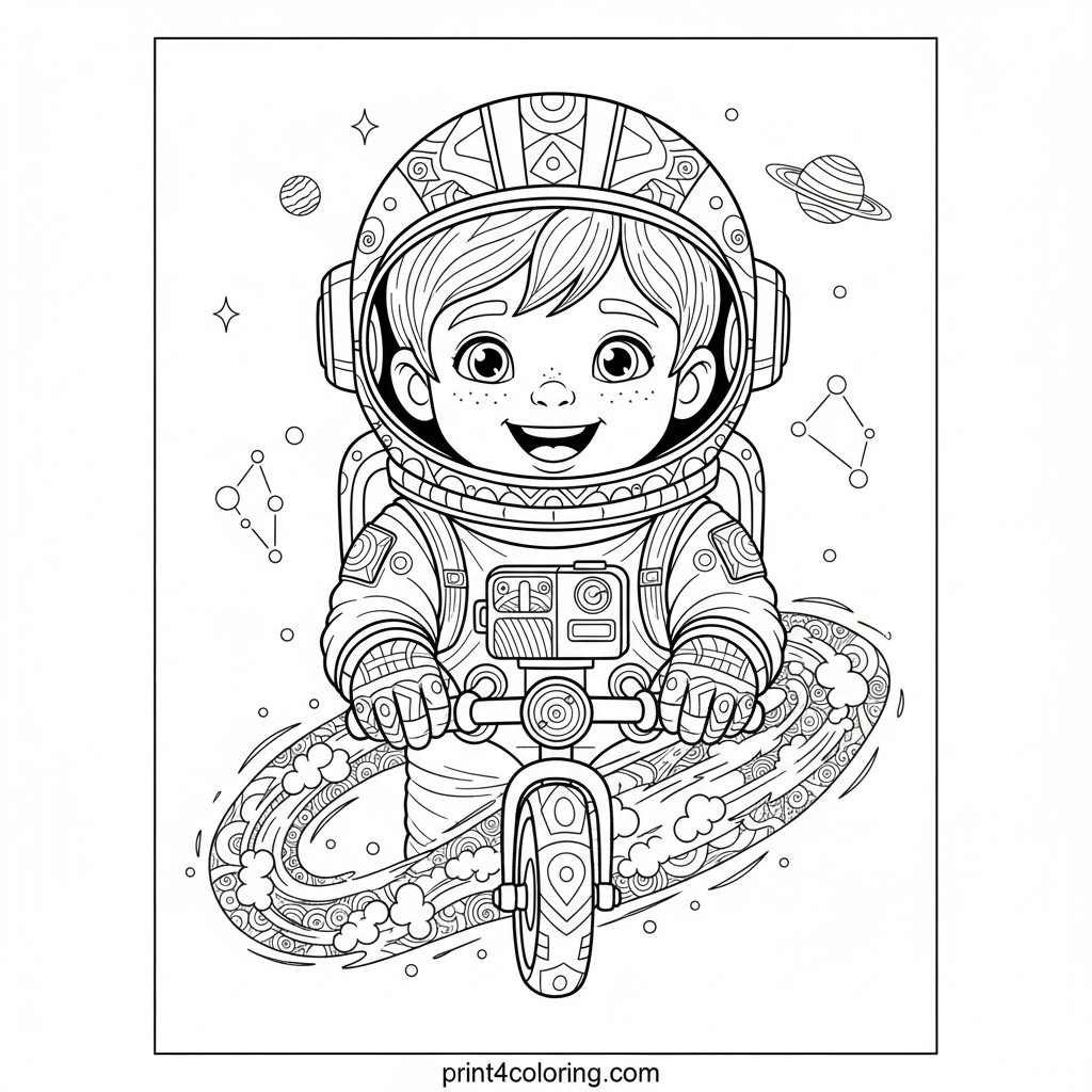 Embark on an epic Stardust Tricycle Adventure! A brave astronaut child, in a friendly space suit, pedals a fantastical tricycle through the cosmos. Glowing stardust, with swirling zentangle patterns, powers the wheels. Intricate planets and constellations, designed with geometric flair, dot the background, inviting you to color a scene of magical exploration and wonder.