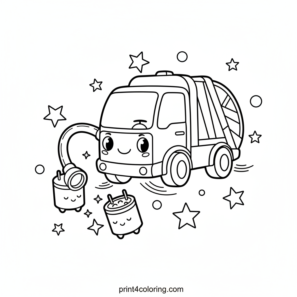 Join our friendly, futuristic space truck as it gently glides through the dazzling cosmos! Watch its special vacuum collect shimmering stardust from cute little alien bins, making the universe sparkle. Get ready to color a scene filled with stars, aliens, and a very cool space vehicle on its important mission to keep space tidy!