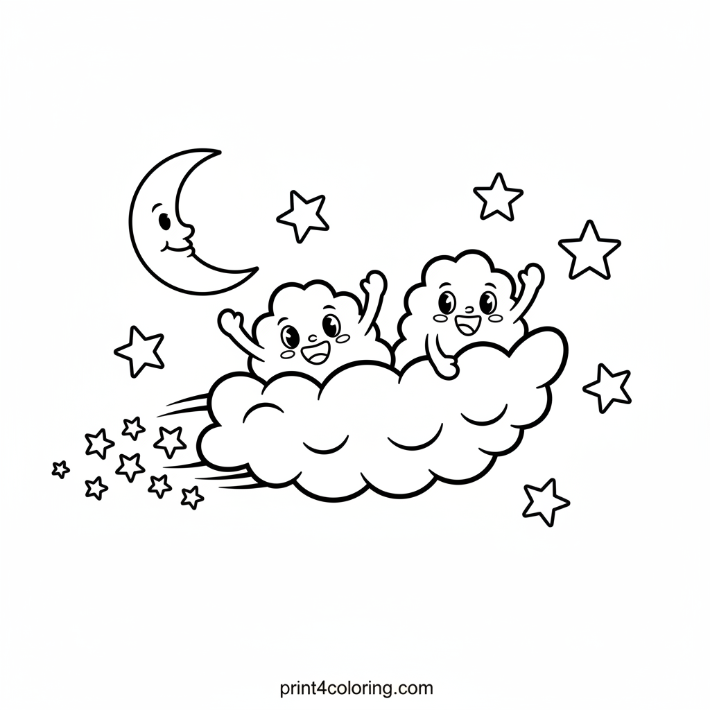 Embark on a dreamy journey aboard a whimsical cloud boat! Sail through a magical night sky filled with twinkling stars and a crescent moon. Two friendly cloud creatures peek over the side, ready for adventure. Bring this enchanting scene to life with your favorite colors!