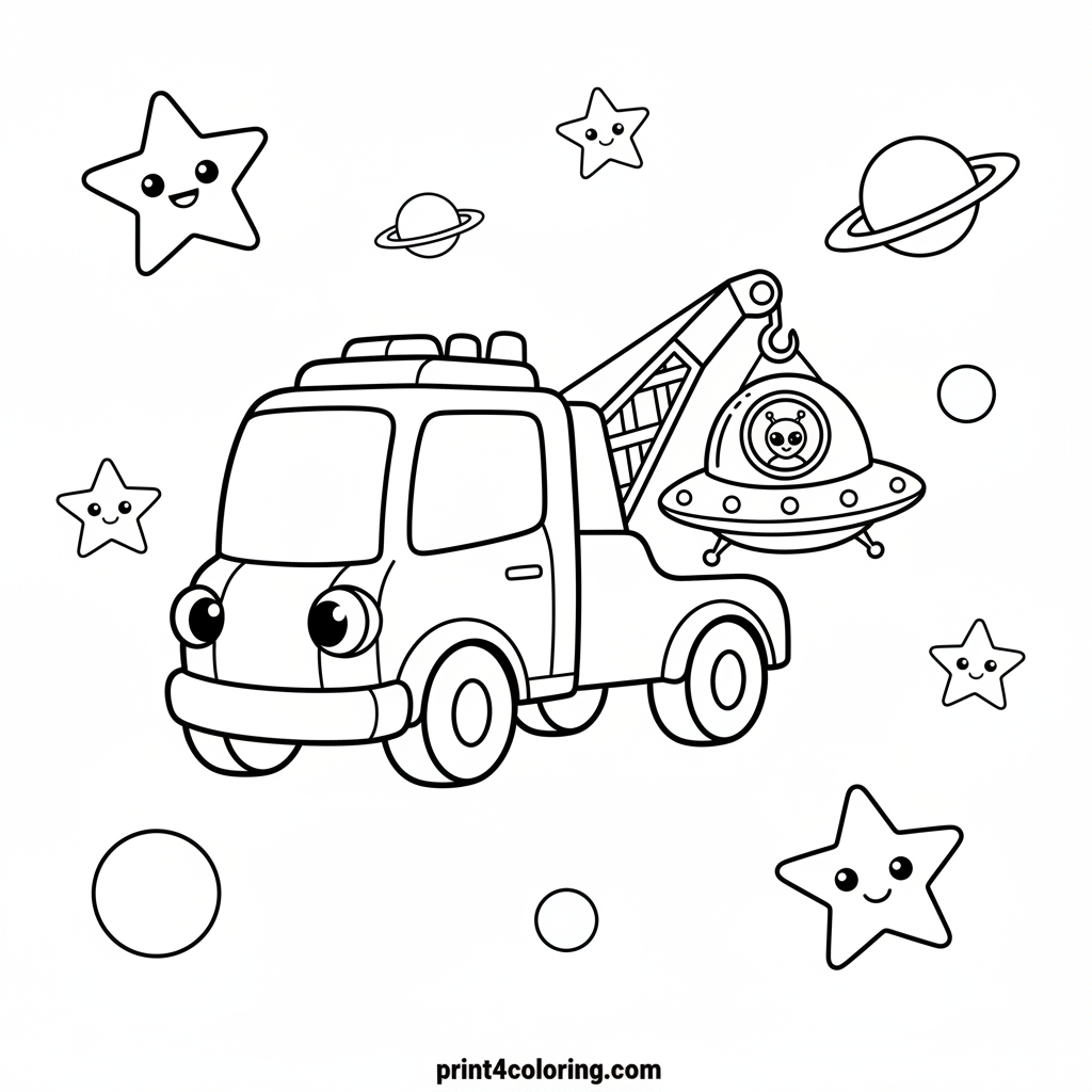 Zoom into the cosmos with a friendly futuristic tow truck on a mission! It's gently helping a bubbly alien spaceship among smiling stars and twinkling planets. Imagine all the bright colors you can use to bring this galactic adventure to life. Get ready for an out-of-this-world coloring experience!