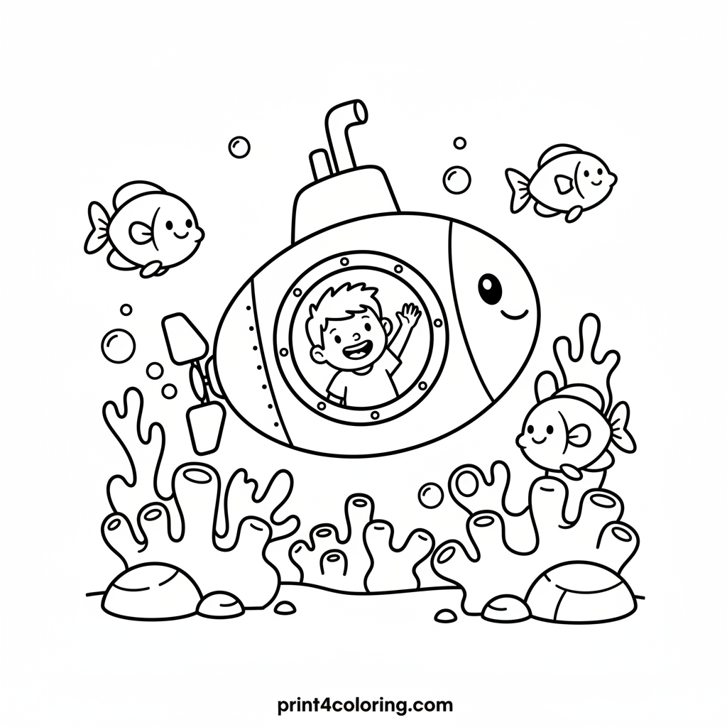 Dive into an amazing underwater world with our Submarine Reef Adventure coloring page! A friendly submarine explores a dazzling coral reef, bursting with colorful fish. A happy child waves from the porthole, ready for discovery. Grab your crayons and bring this exciting ocean scene to life with vibrant hues!