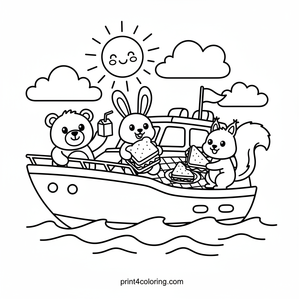 Set sail for fun with our adorable animal friends! A cheerful teddy bear, playful bunny, and cute squirrel are enjoying a delightful picnic on a sunny yacht. They're munching on giant sandwiches and sipping juice, surrounded by sparkling blue water. Add vibrant colors to this joyful, easy scene!
