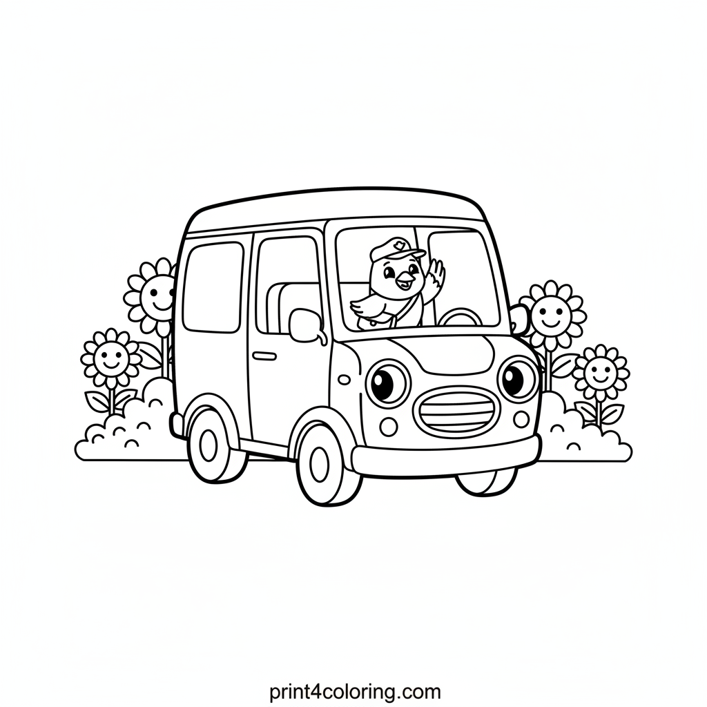 Get ready to color a delightful scene! Our super cute mail van, with its big, happy headlight eyes, is cheerfully driving past a vibrant garden. Smiling sunflowers greet the day, while a tiny bird postman waves hello from the window. Bring this joyful morning delivery to life with your favorite colors!