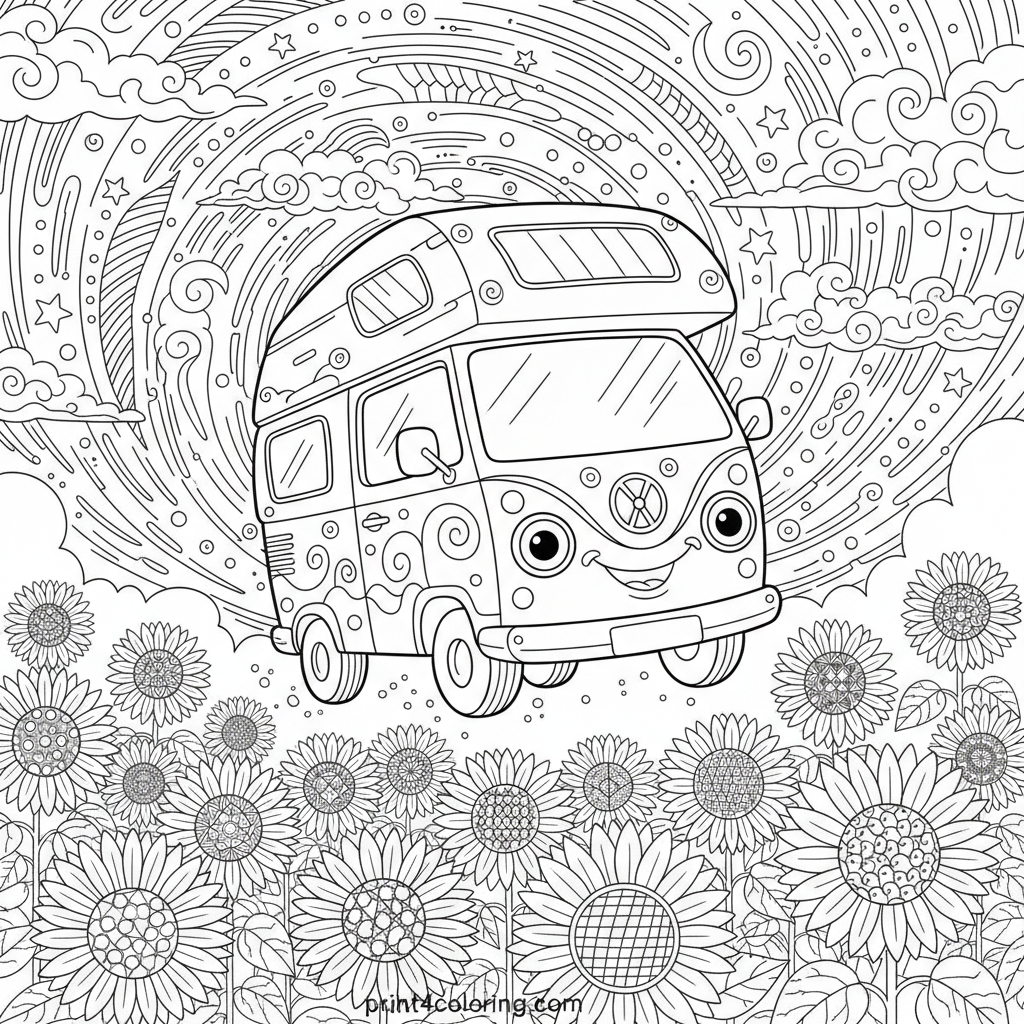 Sunny Sunflower Serenity: Happy Camper Van Adventure Coloring Page