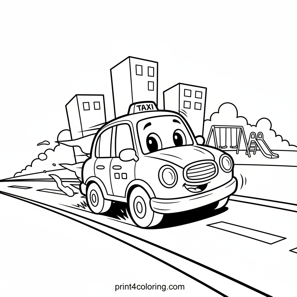 Hop aboard for an exciting adventure! This super speedy city taxi is zooming through a vibrant cartoon street, leaving fun motion lines behind. It's on a special trip, heading straight for a fantastic playground filled with exciting equipment. Get ready to add brilliant colors to this fast-paced urban scene!