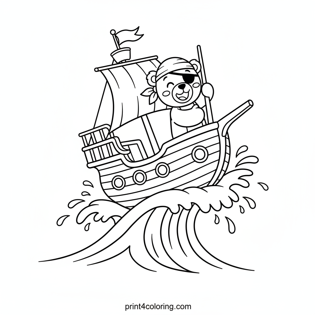 Ahoy there, matey! Join our cheerful teddy bear pirate on a thrilling sea adventure. Watch as his lively pirate ship playfully bounces over a gentle wave, sending bubbly water splashing all around. Our happy bear holds tight to the mast, laughing with pure joy. Grab your crayons and bring this bouncy ocean scene to life with vibrant colors!