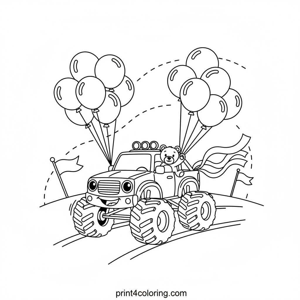 Get ready for a super happy monster truck rolling by! This big, friendly vehicle is covered in bright balloons and streamers, making everyone smile. Look closely, and you'll spot a cute teddy bear peeking out from the passenger seat, waving hello. Join the celebration by adding your favorite colors to this joyful parade scene!
