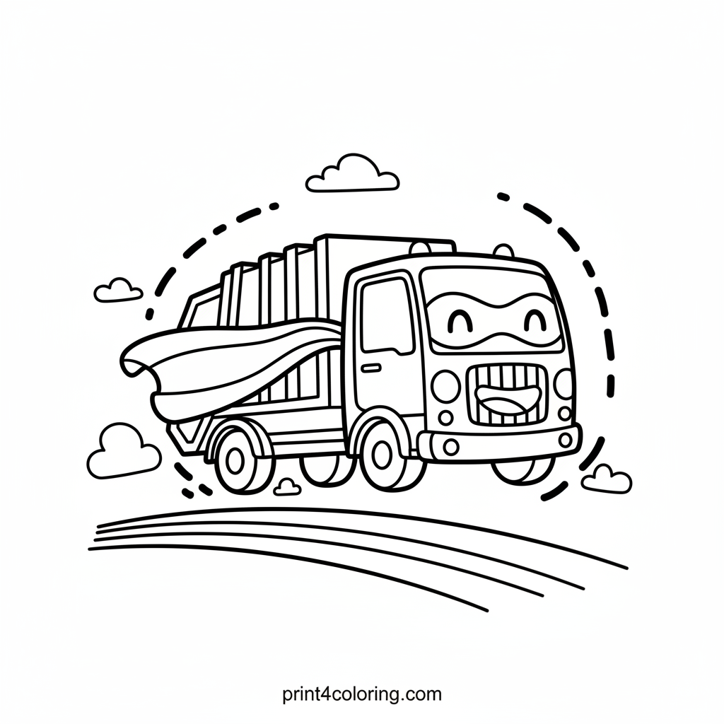 Zoom! Look up in the sky, it's not a bird, it's not a plane, it's our fantastic garbage truck! Dressed in a magnificent superhero cape and a tiny mask, this grinning hero is on a mission to keep our streets clean, all while playfully soaring through the air. Get ready to add vibrant colors to this super-powered vehicle!
