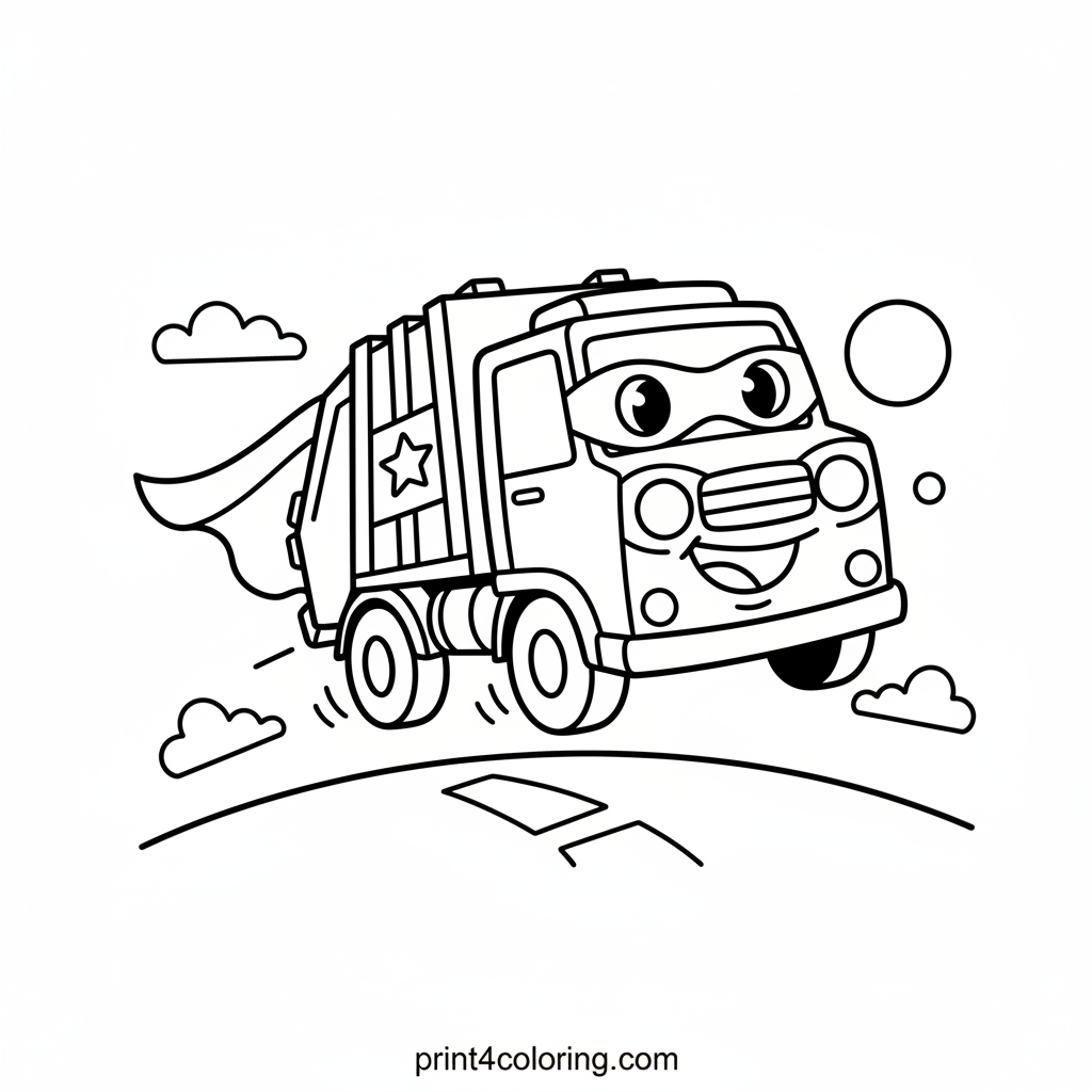Zoom! Look who's here to save the day! It's a super-duper garbage truck, but wait, it's wearing a superhero cape and mask! Watch as this playful truck 'flies' down the street with a huge smile, ready for adventure. Grab your crayons and bring this heroic vehicle to life with vibrant colors!
