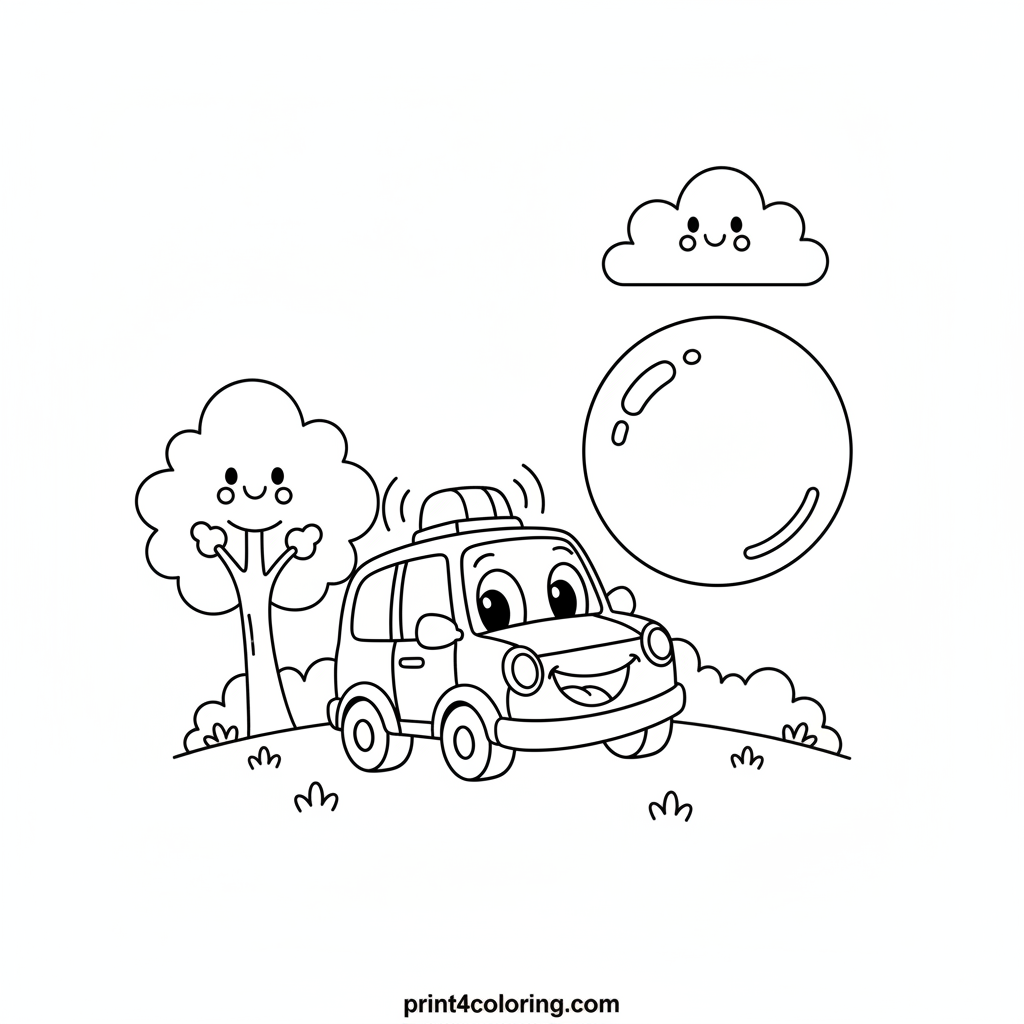 Imagine a happy police car with a funny face, boop-booping its siren as it playfully chases a HUGE, shimmering bubble! This joyful scene unfolds in a sun-drenched park, inviting you to add bright colors to the car, the giant bubble, and the cheerful surroundings.