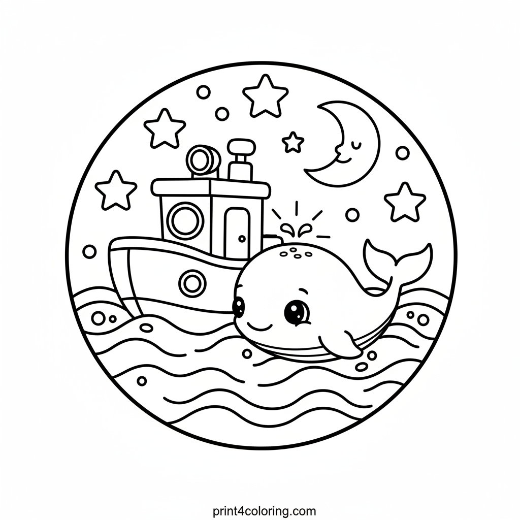 Join a brave little tugboat as it shines its gentle light through a starry night, helping a lost baby whale find its way home. Imagine the soft waves and the quiet courage as they journey together under the moonlit sky. A heartwarming scene perfect for coloring!
