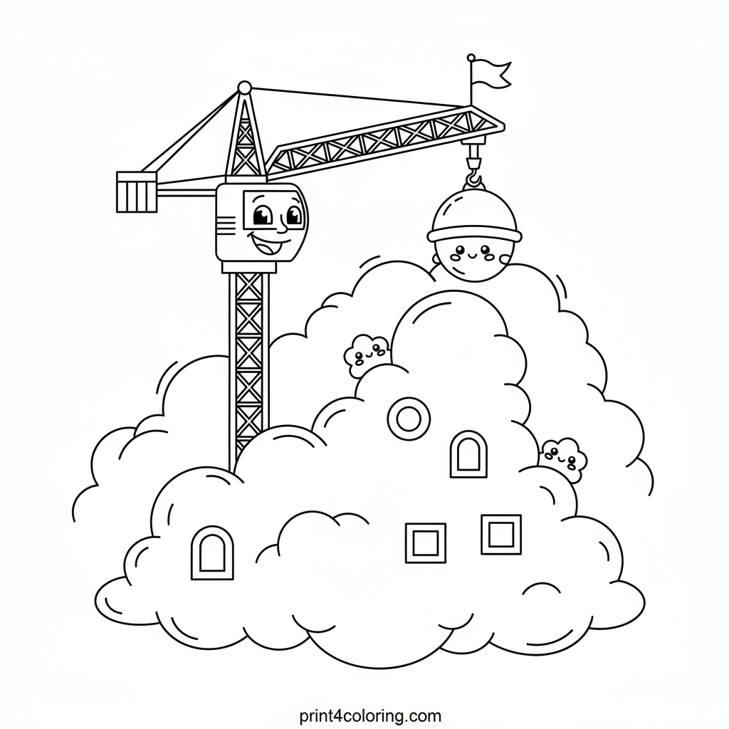 Imagine a cheerful construction crane gently placing the final turret on a majestic cloud castle! Little fluffy cloud friends wave from the castle windows, excited for their new home in the sky. This magical scene invites you to add vibrant colors to the crane, the magnificent castle, and the smiling cloud characters high above.