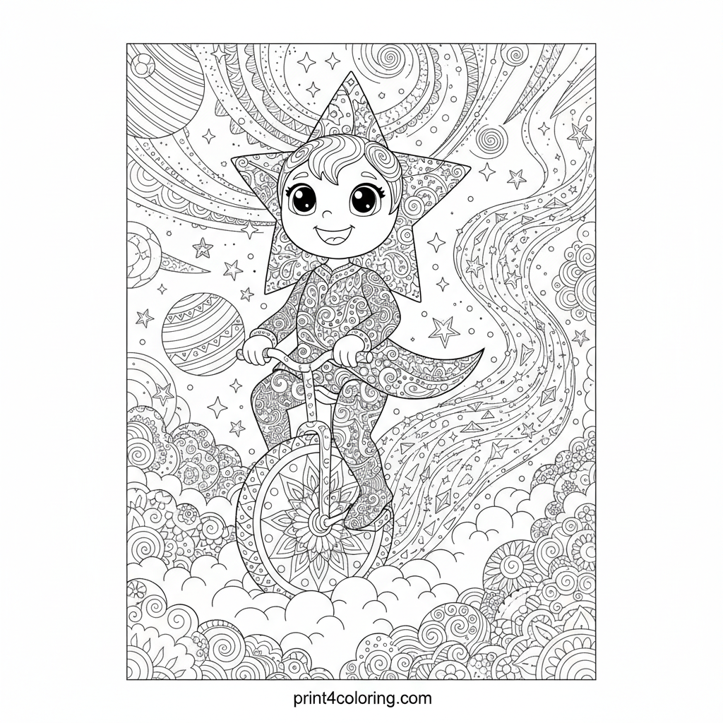 #dream-weaver#star-sprite#cosmic#clouds#unicycle#fantasy#space#glowing#coloring-page#printable