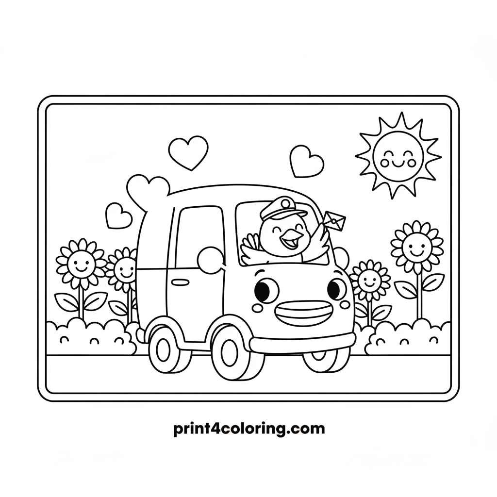 Join the super cute mail van on its morning route! With big, happy headlights for eyes, it gently drives past a sunny garden. Smiling sunflowers wave hello, and a tiny bird postman joyfully waves from the open window, ready to deliver happiness. Get your crayons ready for a delightful and cheerful coloring adventure!